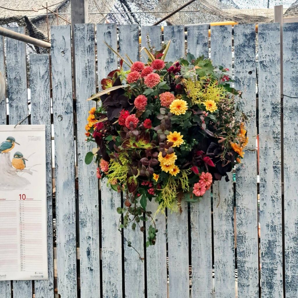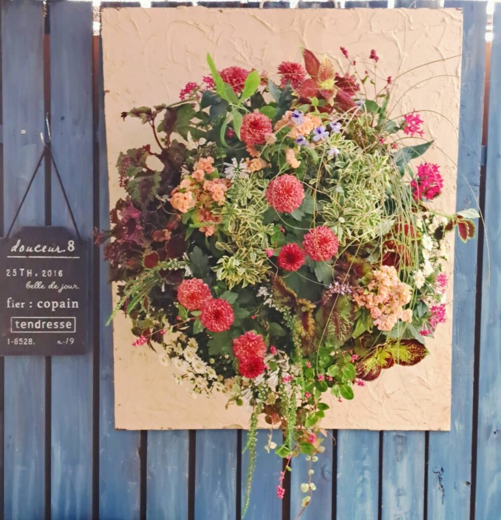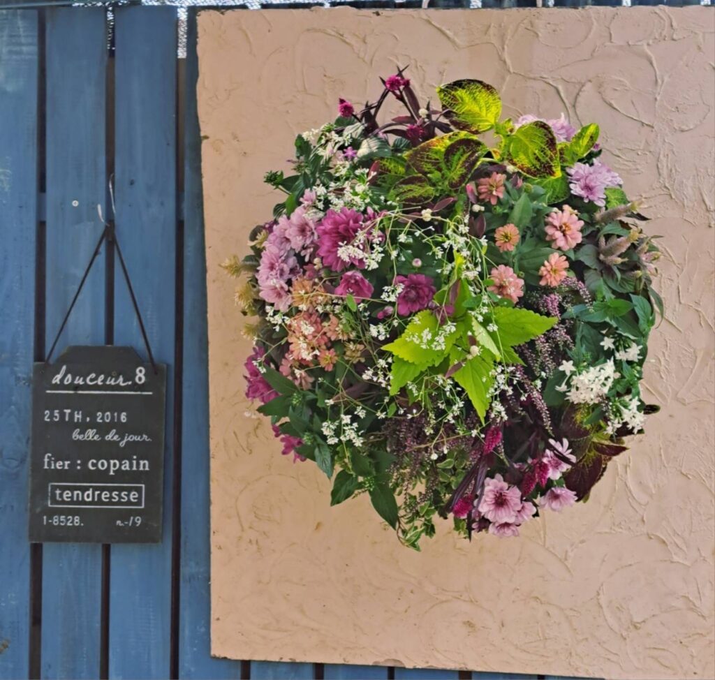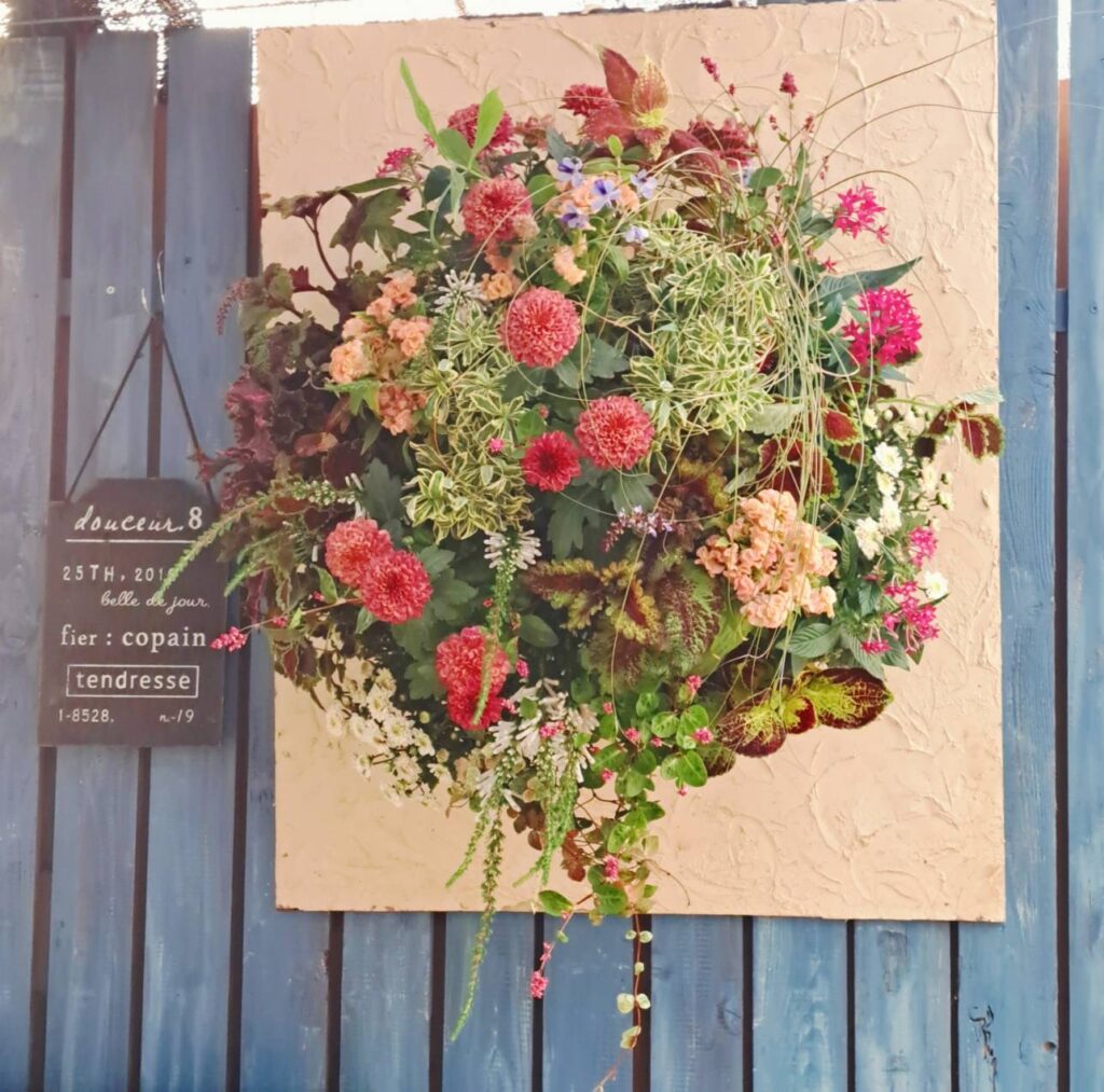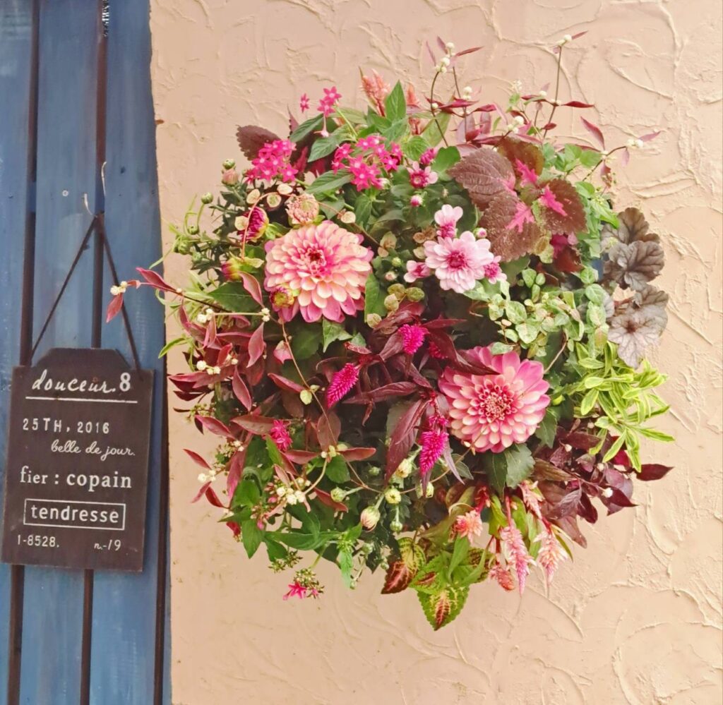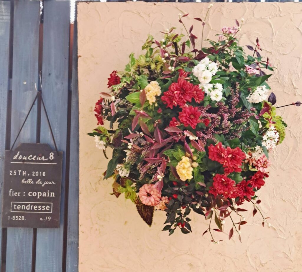 ステムの長い植物の使い分けや温もりを感じさせる色彩、ダイナミックな中に繊細で小さな花達の秋の深い、しみじみとした魅力がステキな作品。