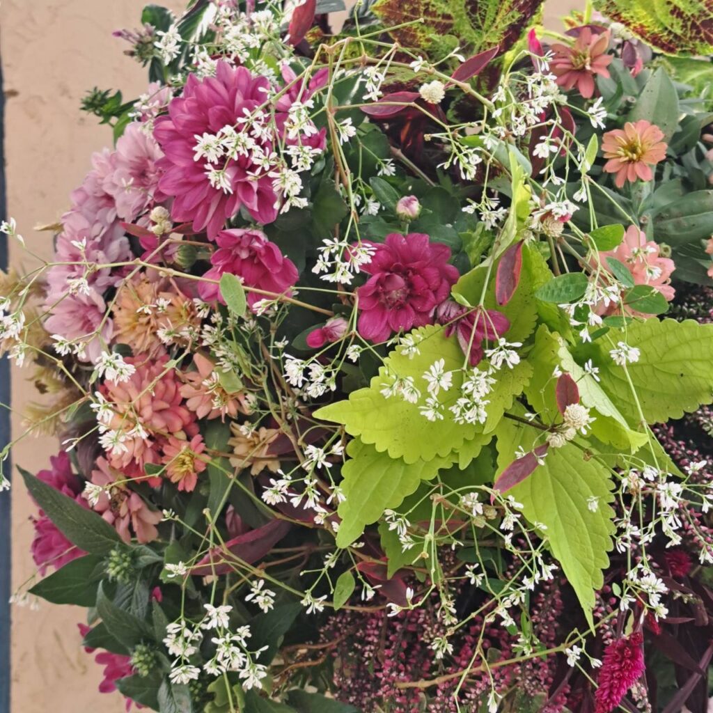 ダブルダリアのグラデーションを金平糖のような小花やセロシアの花穂が優しく柔らかな雰囲気にしてくれています。