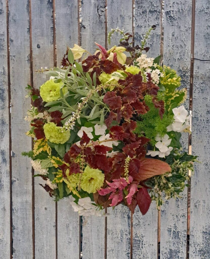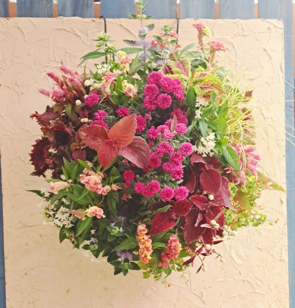 ⑥秋色乙女チックなカラーデザイン。 濃いピンクの同色のメインに、敢えて寄せたカラーの小物使いや、個性的なコリウスが主張する事なく、さりげなく引き立て大きく育ったカレックスもハイセンスで魅力的な見せ場になりました。