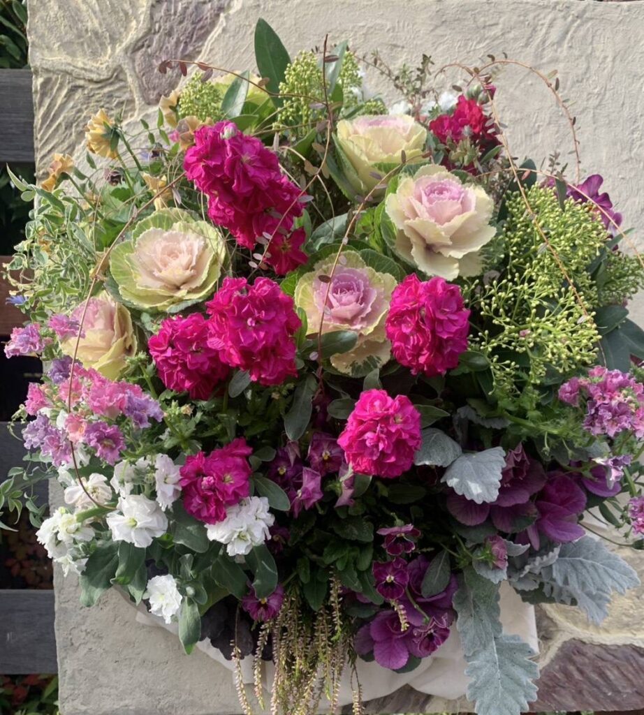 ④目に飛び込むラズベリーピンクが重くならないよう柔らかな小花達が良いバイプレーヤーになりました。