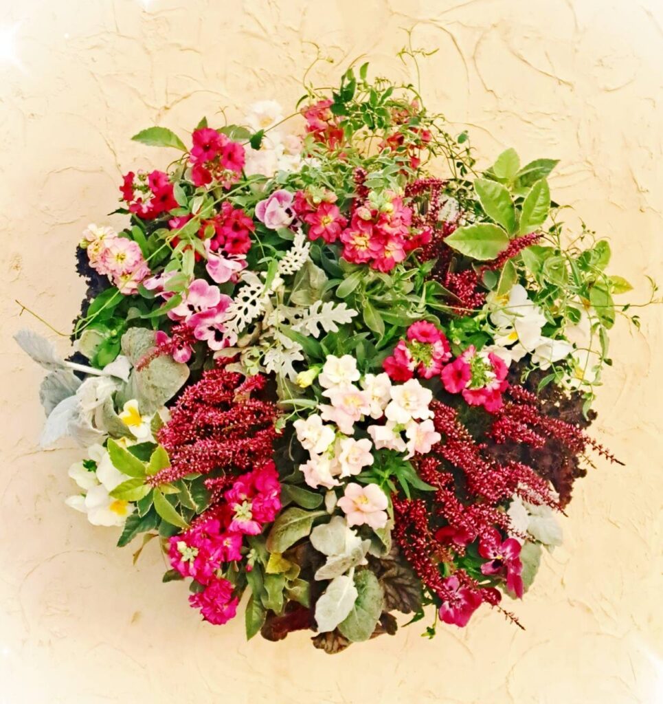⑥夏の季節より激しく発色するコリウスの圧倒的な美しさを大胆にデザイン。季節が進みコリウスをカットした後からのセカンドステージには冬苗の可愛いお顔が登場します。深く堪能出来る作品になりました。